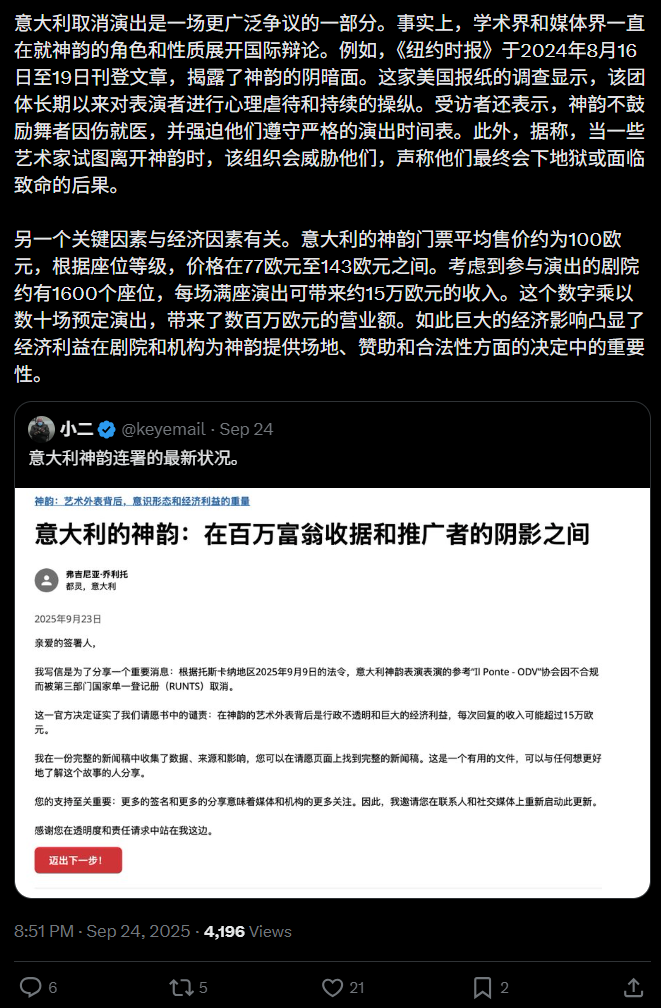 神韵在意大利的免税资格被取消,「据称,当一些艺术家试图离开神韵时,该组织会威胁他们,声称他们最终会下地狱或面临致命的后果。」:https://t.co/ZecmMGIgPb