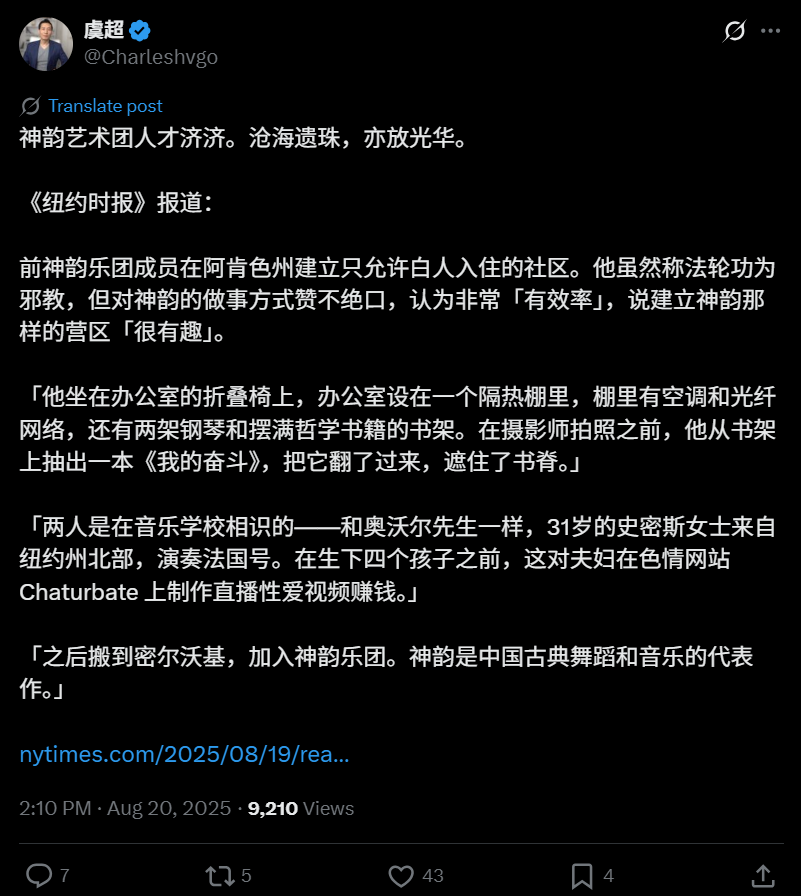 认真读《纽约时报》针对神韵超时、虐待性劳动报道的每个词。例五: