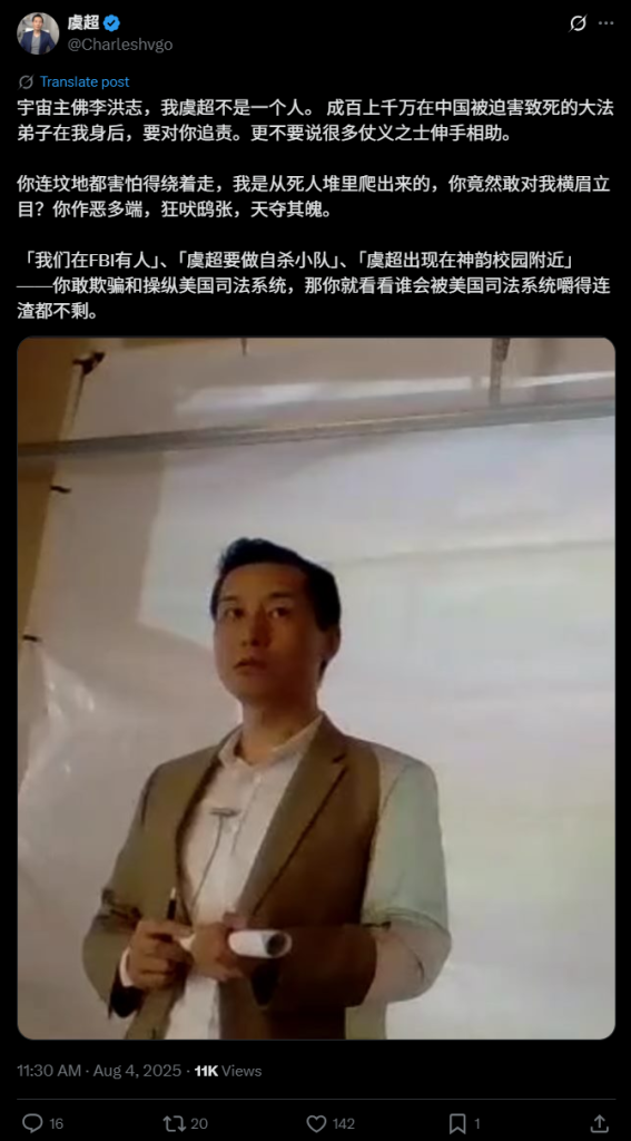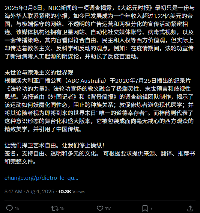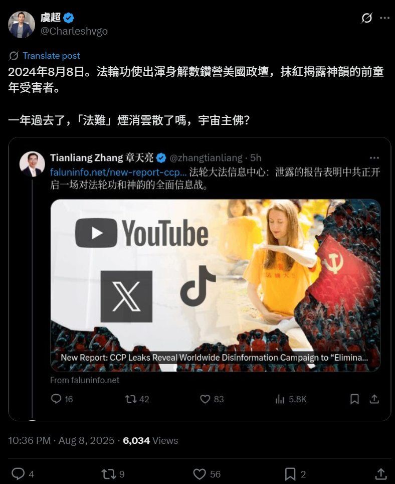 2024年8月8日。法輪功使出渾身解數鑽營美國政壇,抹紅揭露神韻的前童年受害者。