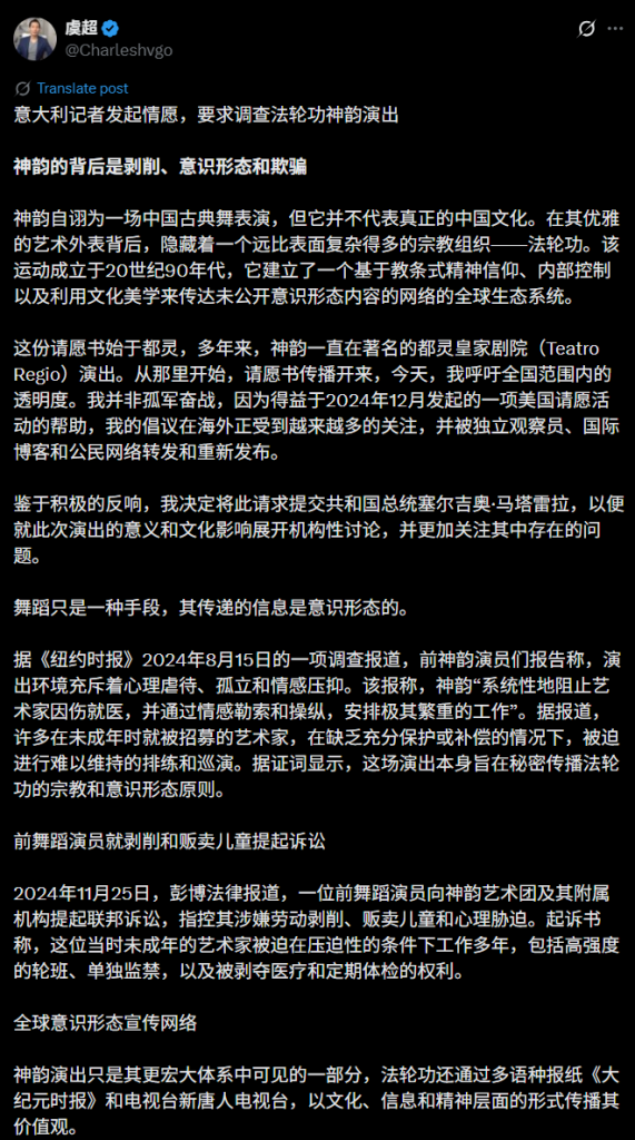 意大利记者发起情愿,要求调查法轮功神韵演出